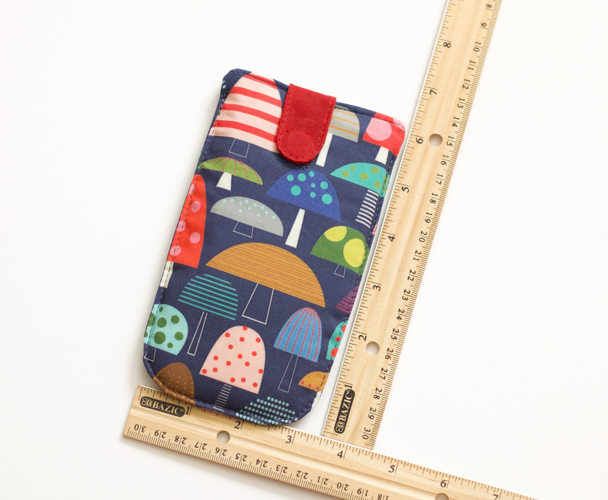 La tela exterior es de algodón con un colorido estampado de hongos, la tela interior es de espuma suave y gruesa para cuidar los lentes, el cierre de la correa es de lona encerada con un pequeño imán dentro.