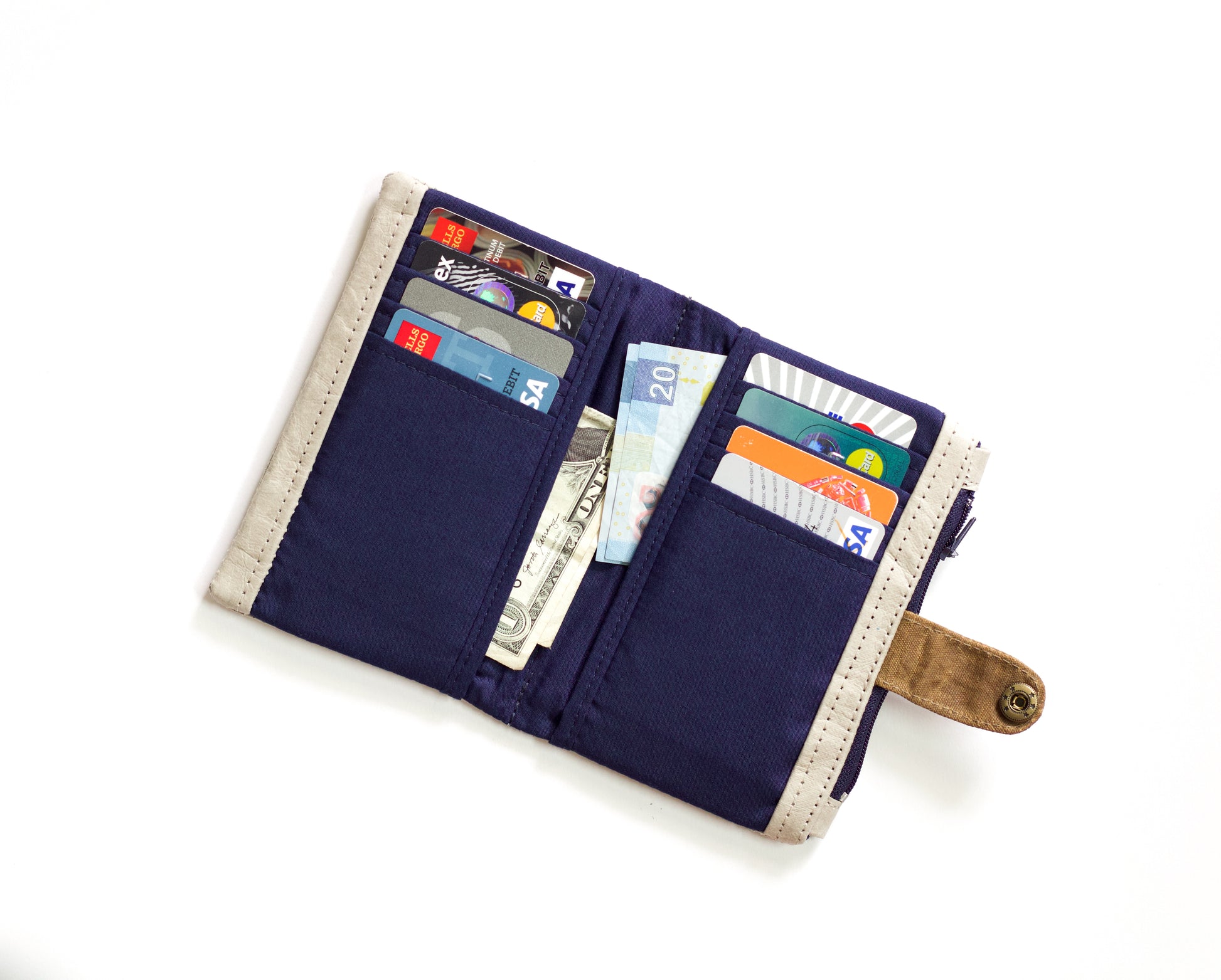 Tiene: 8 ranuras para tarjetas, 1 bolsillo con cremallera y 2 espacios traseros para billetes