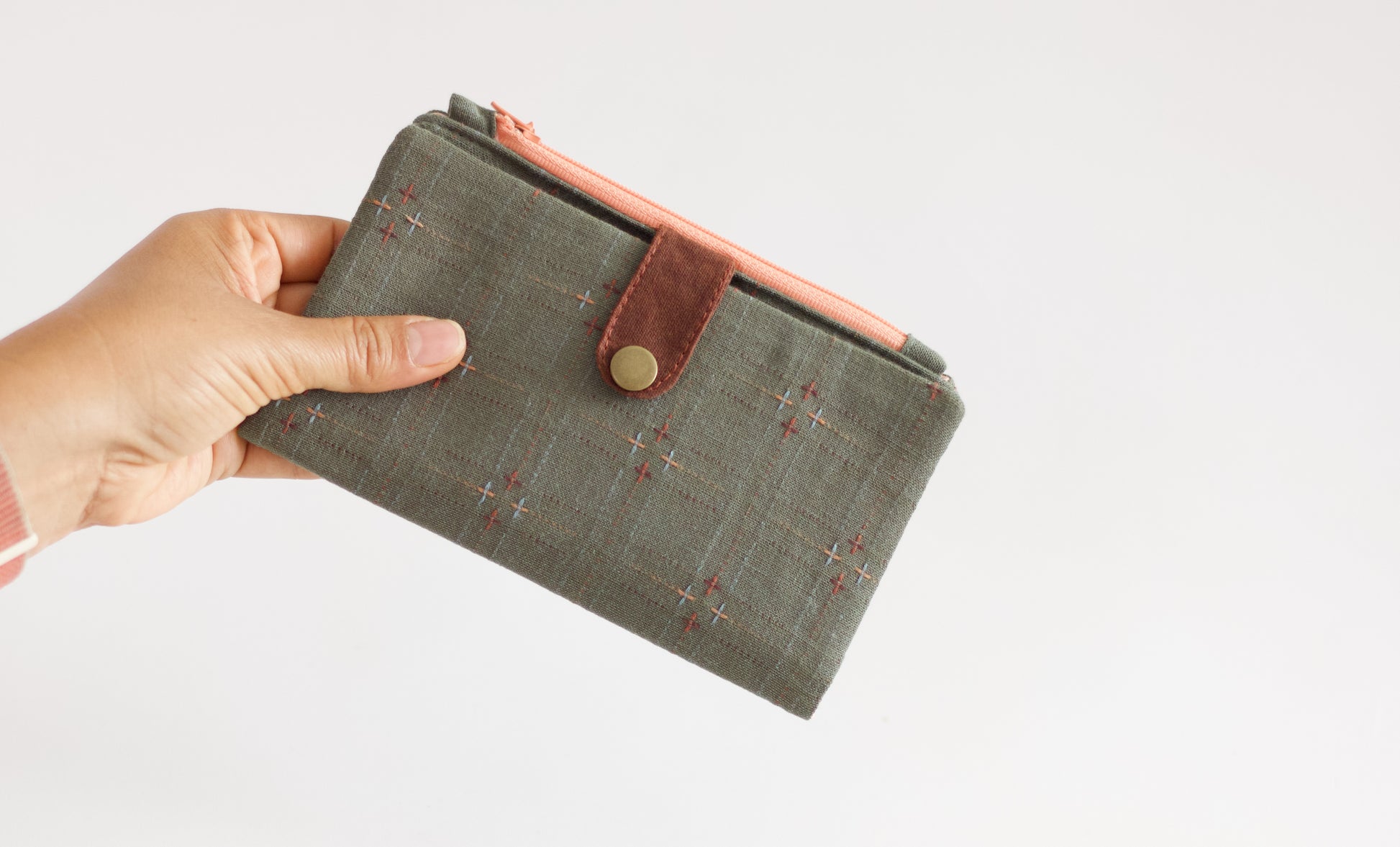 Cartera larga bordada para mujer, cartera con puntos reales color salvia, cartera de sashiko de tela, cartera única para mujer, organizador de tarjetas de crédito