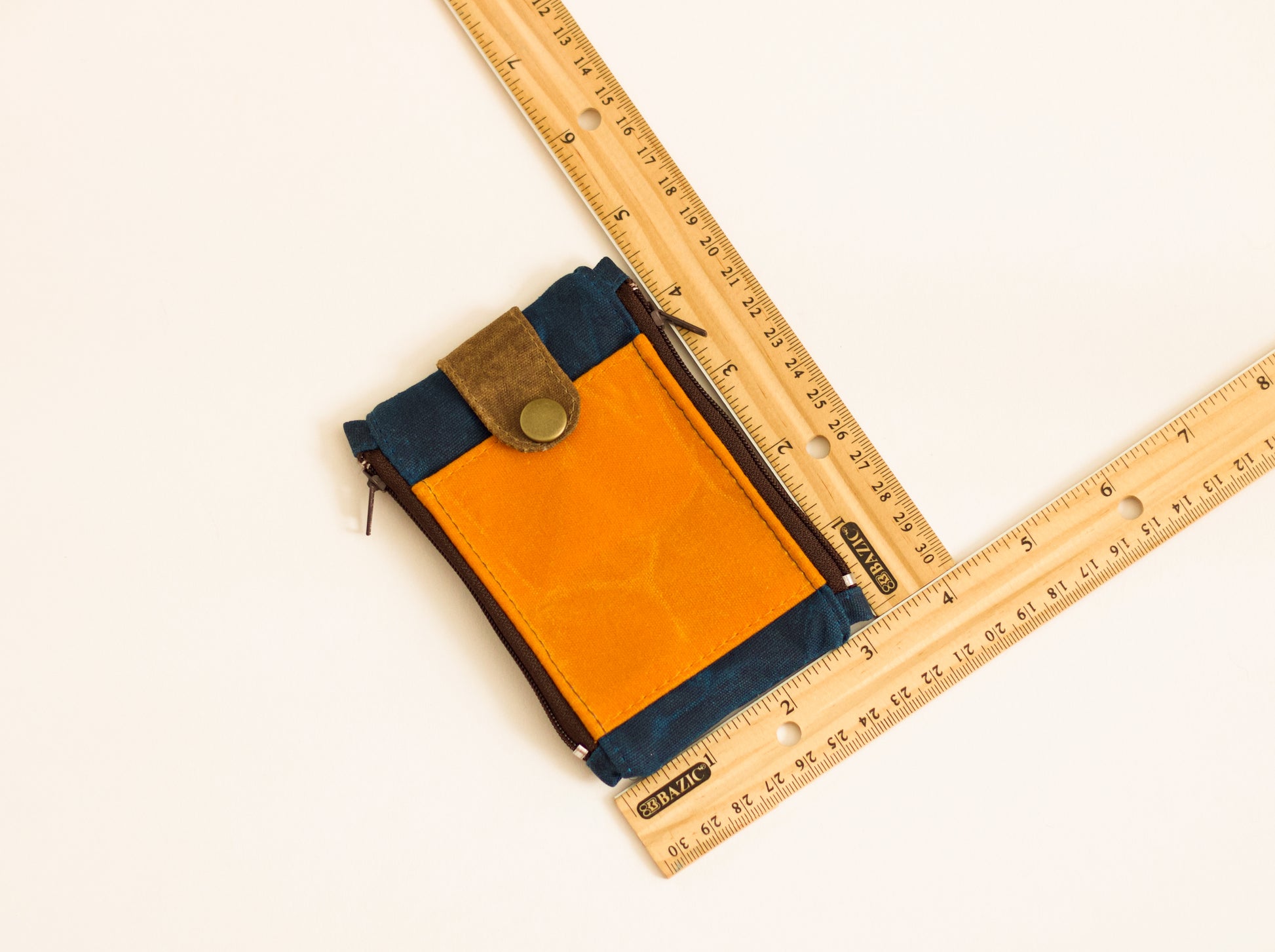 Tiene: 1 bolsillo frontal para tarjetas y 2 espacios laterales con cremallera. Está hecha con lona encerada (impermeable) en color azul marinero y naranja mango, las cremalleras laterales son color burdeos y la correa de cierre es color marrón nuez con un botón color oro viejo.